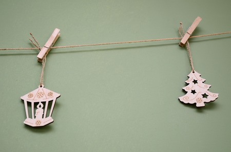 Wooden Christmas toy on a rope with a clothespin on a green background - Christmas tree and Lantern