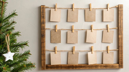 Christmas greeting cards hanging on clothespins in a wooden frame on a white background