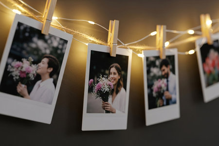 Couple cherish memory photos hung with clips and glowing lights symbolizing forever dedication and shared history.