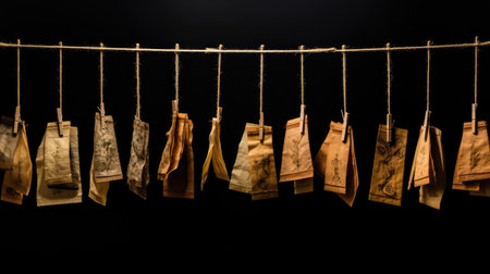 A charming scene featuring vintage film strips pinned to a clothesline with wooden clothespins, ideal for artistic design or nostalgic projects that celebrate history and creativity.