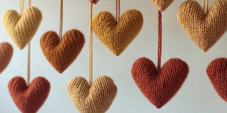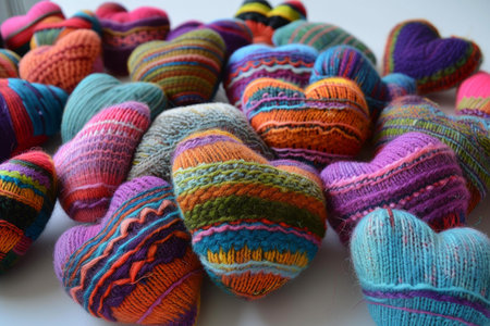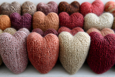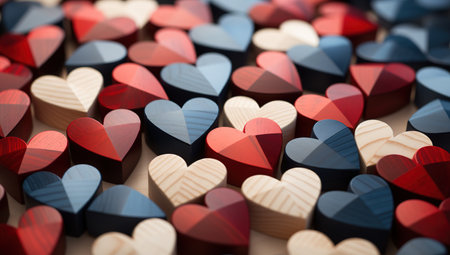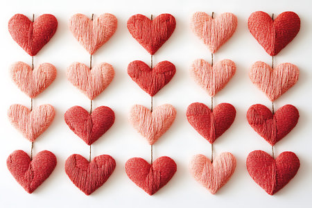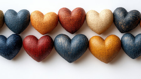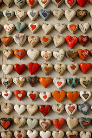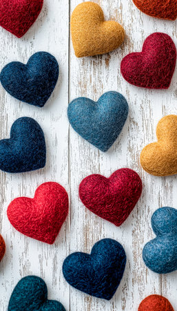 Vibrant felt heart cutouts artfully scattered across weathered white wood evoke warmth and handcrafted charm, perfect for romantic or craft-themed occ