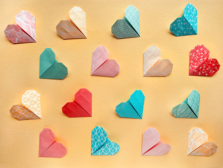 Colorful Origami Paper Hearts Arranged in Symmetrical Patterns on Beige Background
