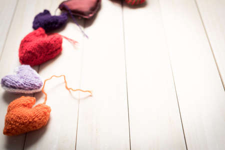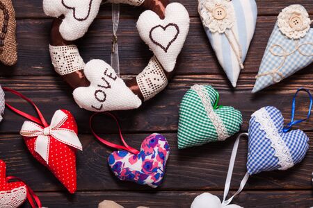 Colorful textile hearts on the floor. Studio shot on wooden background.