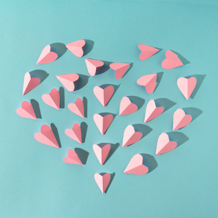 Pink hearts cut from a folded paper with 3d effect, forming a big heart on turquoise background. Valentines Day celebration concept.