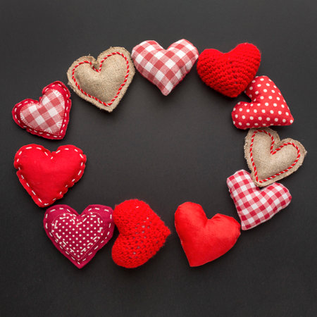 A row of red hearts from felt. Background for congratulations on Valentine's Day. Background for sale. Black lettering paper.