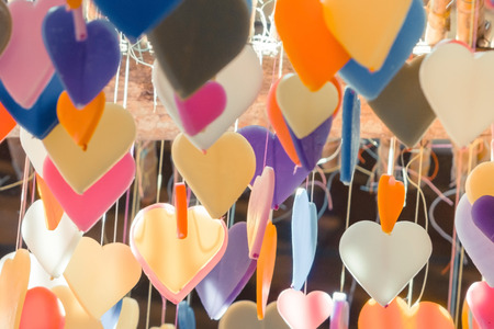 Colorful of hearts made of candle pattern designs hanging from ceiling to decorated on Love Valentines celebration day or wedding day.