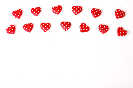Red clay plasticine made are many hearts arrange horizontally on white background, cute valentine dough