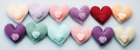 Four knitted hearts in a row lie on a red background. Background for Valentine's Day. A postcard, a banner for February 14 with a place to copy. Space for copying. Flat position, top view.