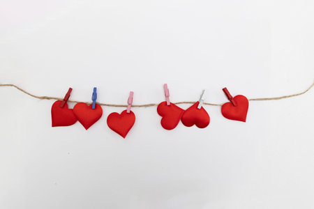 Several red heart shapes are attached to a rustic string with different colored clothespins against a plain white background. This is meant as digital content for Valentines Day.