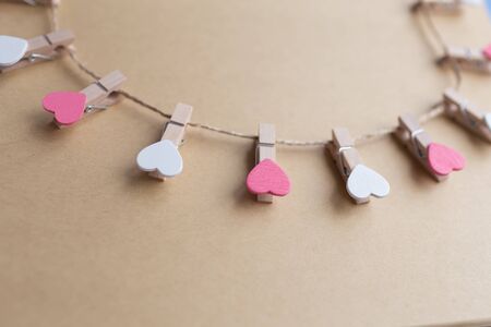 Clothespins with wooden hearts at the end on a gray background Valentines day holidays decoration