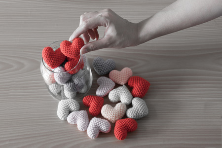 woman hand put red Heart yarn in a glass jar, Vintage filter