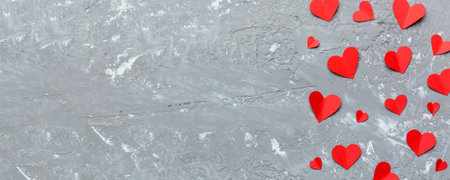 A close-up of a white surface scattered with numerous red and pink hearts, creating a romantic and festive backdrop for Valentine's Day.