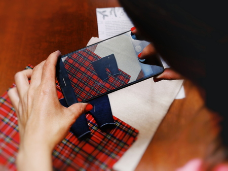 Woman Photographs on Smartphone sewn clothes for Dolls. Home business concept.
