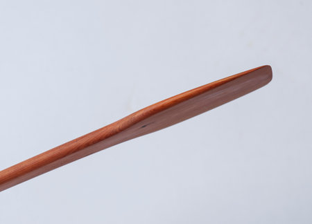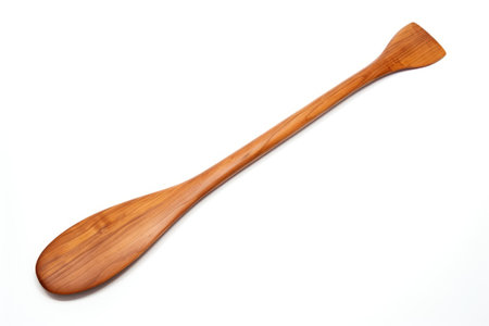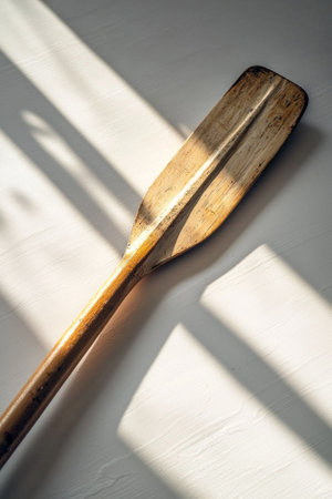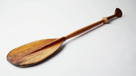 rowing oar is laid flat against a white background highlighting intricate details of the blade and handle. Soft shadows enhance the midday lighting creating a realistic aesthetic.