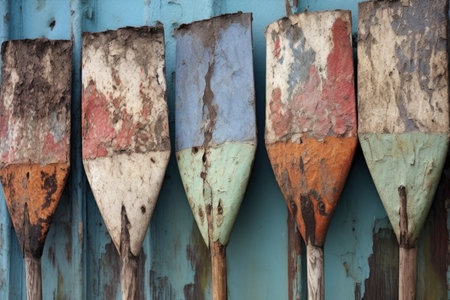 weathered oar tips with peeling paint, created with generative ai
