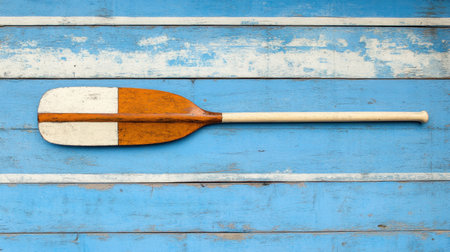 A vintage wooden paddle rests on a weathered blue and white background, showcasing craftsmanship and nautical charm for decor or creative projects.