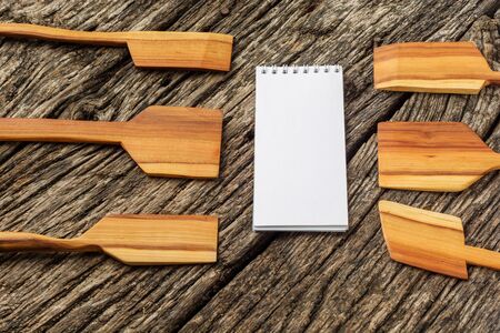 Recipe notepad with kitchen tools on old wooden background