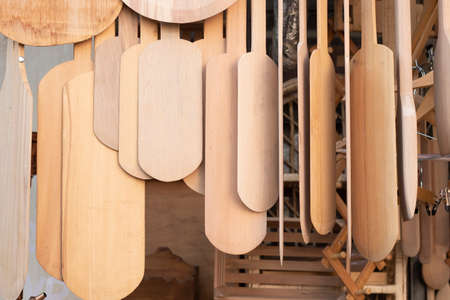 Detail shot with several wooden canoe paddles