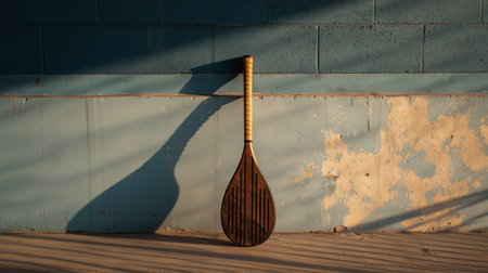 Wooden paddle resting against a blue wall during golden hour light