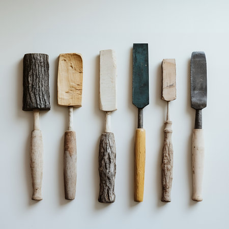 A row of wooden tools on a white background.