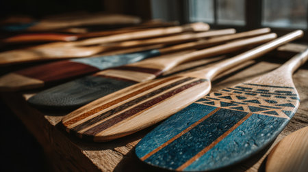 Medium shot capturing diverse paddles made from sustainable materials fanned out on a table illustrating ecofriendly bidding options.