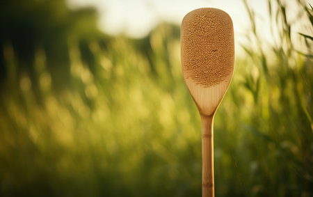 Wooden spatula on the background of green plants in the garden