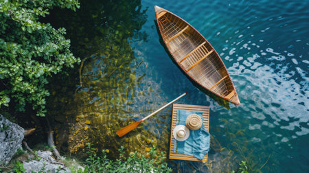 A close-up captures a person rowing a wooden boat, the oar creating ripples in the water. The image features natural light and a shallow depth of field, focusing on the water texture and the boat's details. The scene suggests outdoor recreation and travel, potentially suitable for various commercial uses.