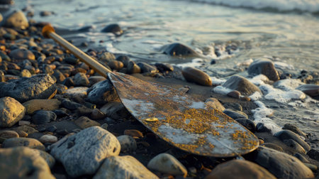 A wooden paddle rests on the sandy beach by the waters edge, surrounded by natural materials like rocks. Perhaps left behind by a kayaker exploring the lake AIG50