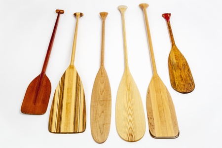 wooden canoe paddles of different shapes and sizes including a classic beaver tail on white background