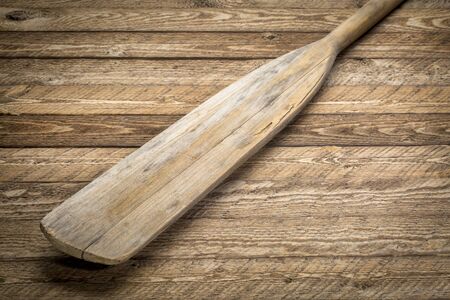 blade of vintage wooden canoe paddle against weathered wood background