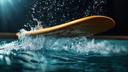 A wooden paddle is in the water, and the water is splashing around it. The image has a playful and fun mood, as the paddle is being used for a sport or recreational activity