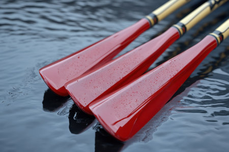Three vibrant red rowing oars lie on the surface of tranquil water, reflecting morning light and tranquility.