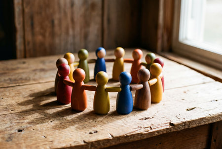 A diverse group of colorful wooden peg dolls stands in a circle holding hands on a rustic wooden surface near a window to symbolize unity teamwork and community togetherness.