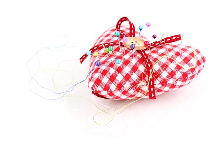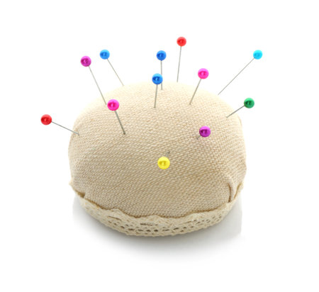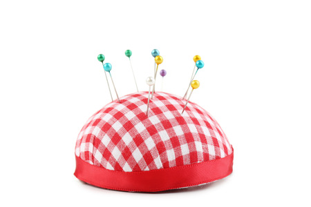 Checkered pincushion with pins isolated on white. Sewing accessory