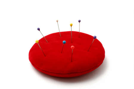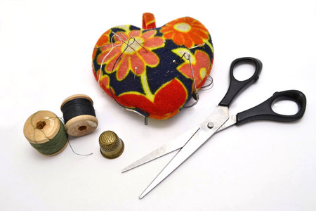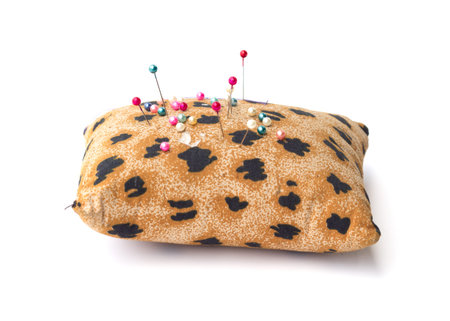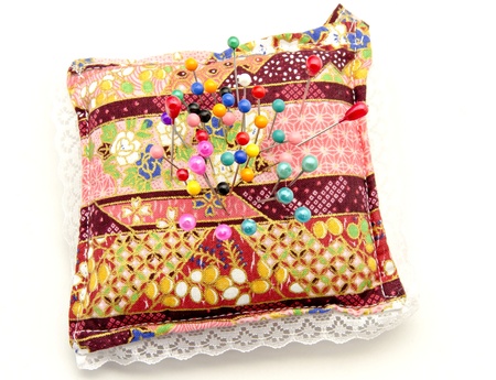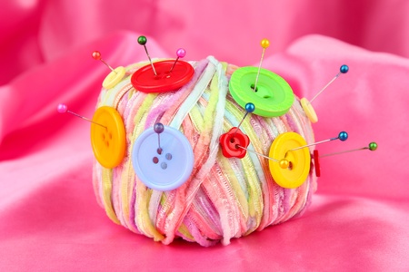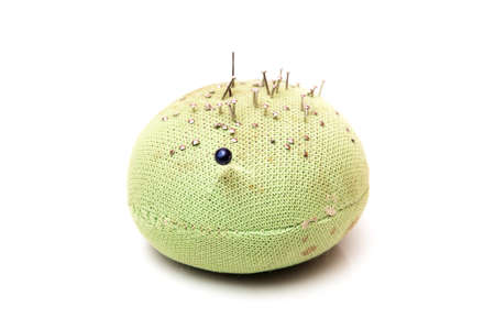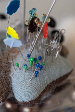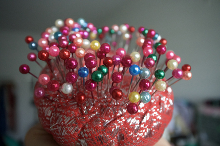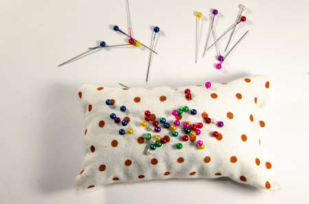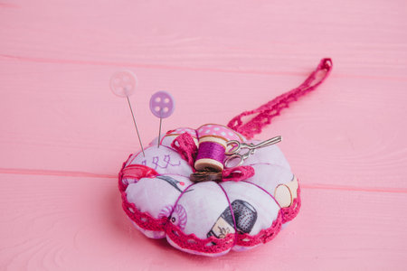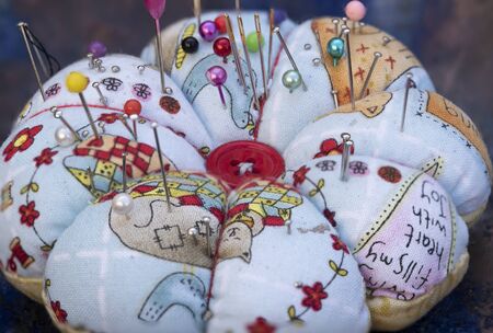Dressmaker's pin cushion with essential pins and needles for seamstresses. Nice and flirty bag full of hand-picked wadding and needles and pins used in sewing work.