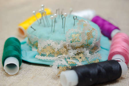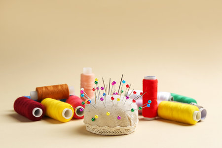 Pincushion with pins, needles and coils of threads on beige background, closeup