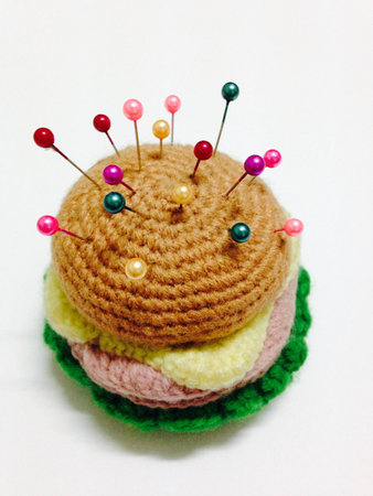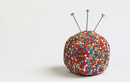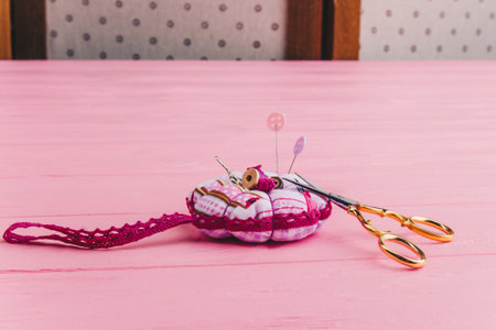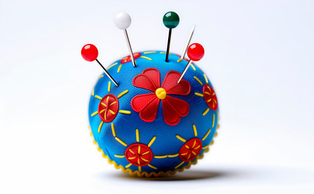 Colorful needlework station with pin cushion and craft supplies in cozy workspace. That the image is generated using AI.