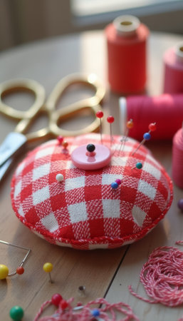 A delightful sewing scene featuring a red and white checkered pincushion surrounded by colorful threads and scissors. This cozy arrangement evokes a sense of creativity and craftsmanship, inviting crafters to dive into their next sewing project.