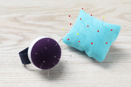 Checkered pincushion with sewing pins on light wooden table, closeup. Space for text