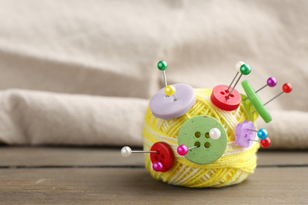 Bright yarn with pins and buttons on wooden table against light cloth, closeup. Space for text