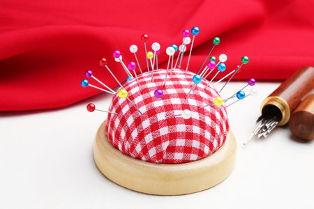 Checkered pincushion with pins, needles and red cloth on light table, closeup
