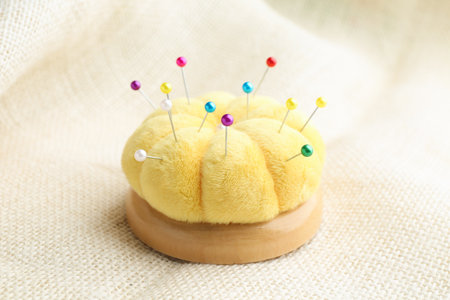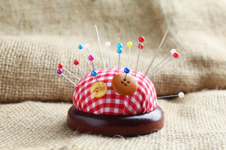 Checkered pincushion with pins and buttons on burlap cloth, closeup