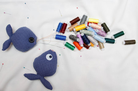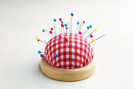 Checkered pincushion with pins and spools of threads on light cloth, closeup