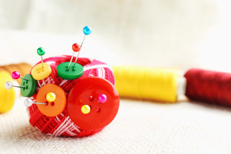Bright yarn with pins, buttons and spools of threads on light cloth, closeup. Space for text