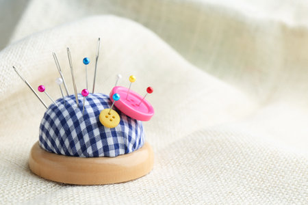 Checkered pincushion with pins, needles and buttons on light cloth, closeup. Space for text