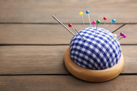 Checkered pincushion with pins and needles on wooden table, closeup. Space for text