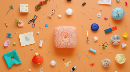An artistic arrangement of various crafting supplies and tools, including scissors, threads, and pom poms, set against a vibrant orange background. Perfect for DIY enthusiasts.