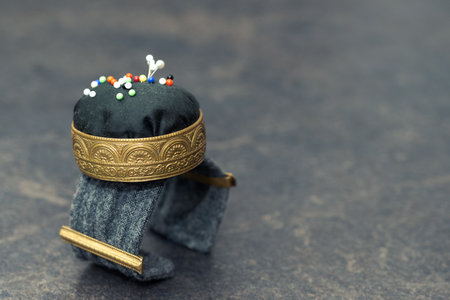 Beautiful selfmade pin cushion for wrapping around the wrist with gold ornaments and colorful needles on dark table