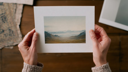 Medium shot of hands holding a matte photo print showcasing a soft texture and muted colors of a landscape image being inspected for quality.