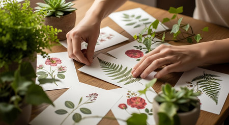 Close up of female florist hands making greeting card with floral elements